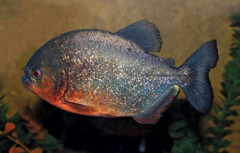 Piranhas range from northern Argentina to Colombia, but they are most diverse in the Amazon River, where 20 different species are found. The most infamous is the red-bellied piranha (Pygocentrus nattereri), with the strongest jaws and sharpest teeth of all. Especially during low water, this species, which can grow up to 50 cm (about 20 inches) in length, hunts in groups that can number more than 100. Several groups can converge in a feeding frenzy if a large animal is attacked, although this is rare. Red-bellied piranhas prefer prey that is only slightly larger than themselves or smaller. Generally, a group of red-bellied piranhas spreads out to look for prey. When located, the attacking scout signals the others. This is probably done acoustically, as piranhas have excellent hearing. Everyone in the group rushes in to take a bite and then swims away to make way for the others.